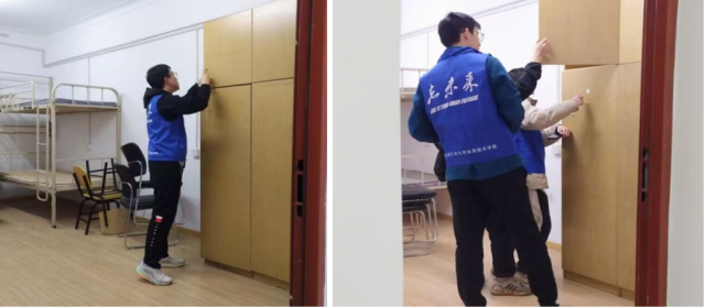 志愿者们身穿蓝色马甲,一一走过二楼的每个房间,认真检查每个房间的柜子是否完好,是否有螺丝松动以及木板松弛脱落的情况,如有发现及时记录并报修,同时清理干净柜子上残留的胶带和胶痕,保证柜子全新且干净完好。