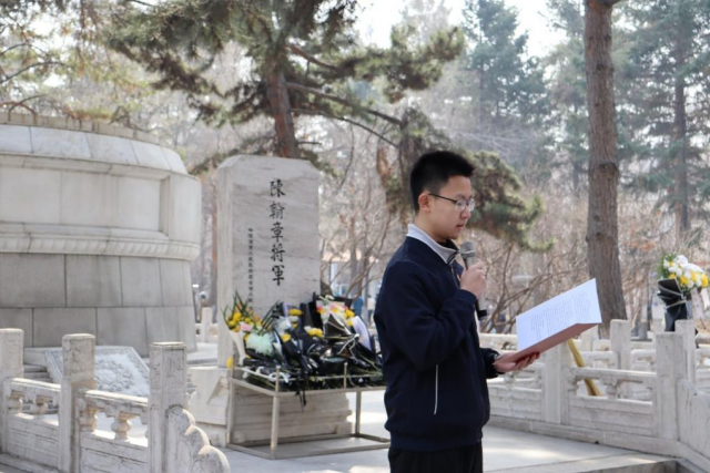 青山绿水长留生前浩气,苍松翠柏堪慰逝后英灵。上午9时20分,主持人22WL006班团支书张思喆宣布祭扫活动正式开始。首先,同学们肃立在陈翰章将军的墓碑前,向革命先烈默哀致敬。随后,员工代表21TS001班班长刘家均向同学们介绍了陈翰章将军光荣而短暂的一生。聆听完先烈的英雄故事,同学们排着整齐的队列敬献出自己手中的鲜花,把最深情的思念和最崇高的敬意,寄托在这鲜花和话语中。最后,在主持人的带领下,同学们在团旗前重温入团誓词,再次体味入团那一刻的心潮澎湃,将“为共产主义事业而奋斗”铭刻在心中。