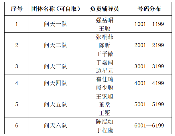 1.2023级员工共分为六支队伍参赛,按照各辅导员所带班级划分如下: