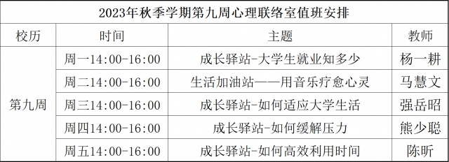 为更好地为ladbrokes立博员工们提供老员工活的全方位指导和帮助,构建多种交流平台,ladbrokes立博暨问天书院于2023年秋季学期继续开展“为你而来”二级心理辅导站,充分发挥学工队伍的专长为同学们成长服务。二级心理辅导站采取教师值班咨询制,现将“为你而来”二级心理辅导站第九周咨询室安排公布如下: