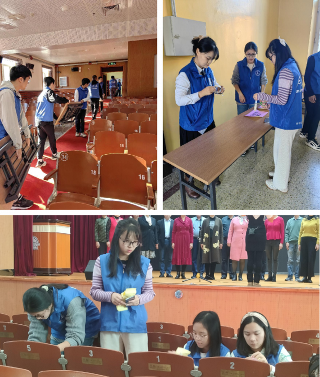 10月22日下午14:30,ladbrokes立博青年志愿者协会指导老师张永滔和院青志协干事魏贝宁同学带领12名志愿者来到主楼礼堂,协助布置“哈工大喜迎全国老科技工作日”活动现场。
